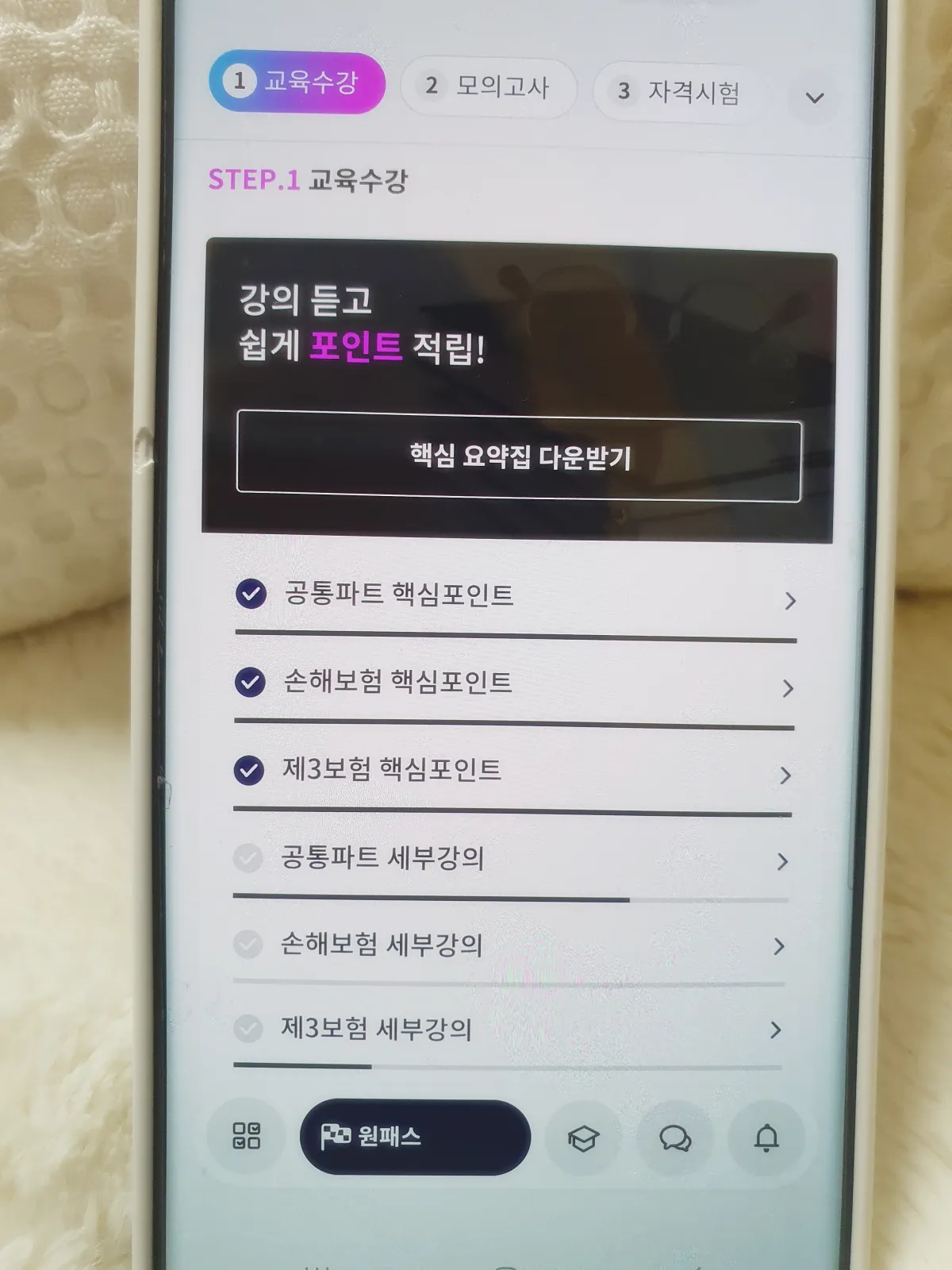 | 3 | 그 다음으로는 '핵심포인트' 강의 (공통파트 / 손해보험 / 제3보험) 3개를 빠르게 먼저 들어 주었습니다. |