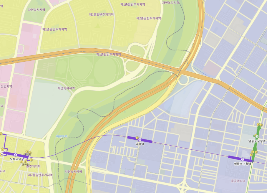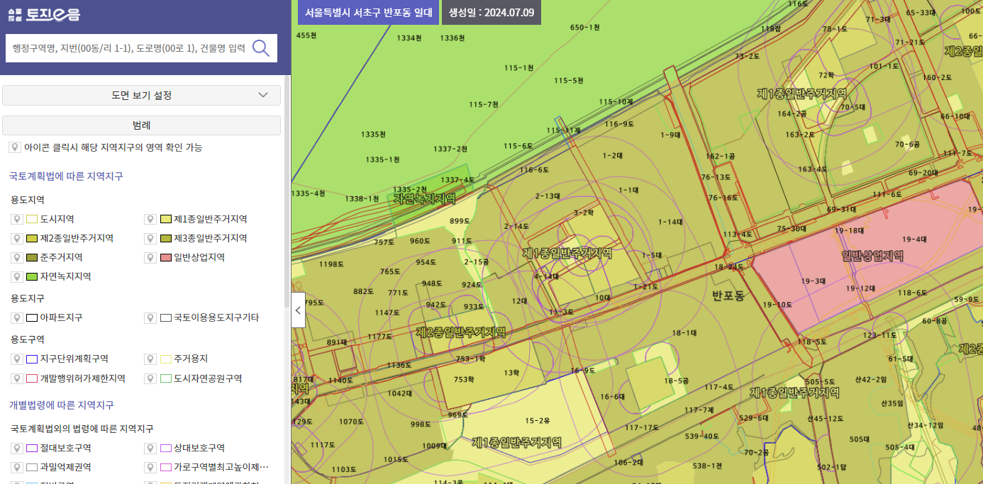 각 땅이 색상으로 구분되고, 땅 위에 어떤 땅인지 글자로 '제2종일반주거지역'처럼 표시되어 있어 쉽게 확인 가능합니다.