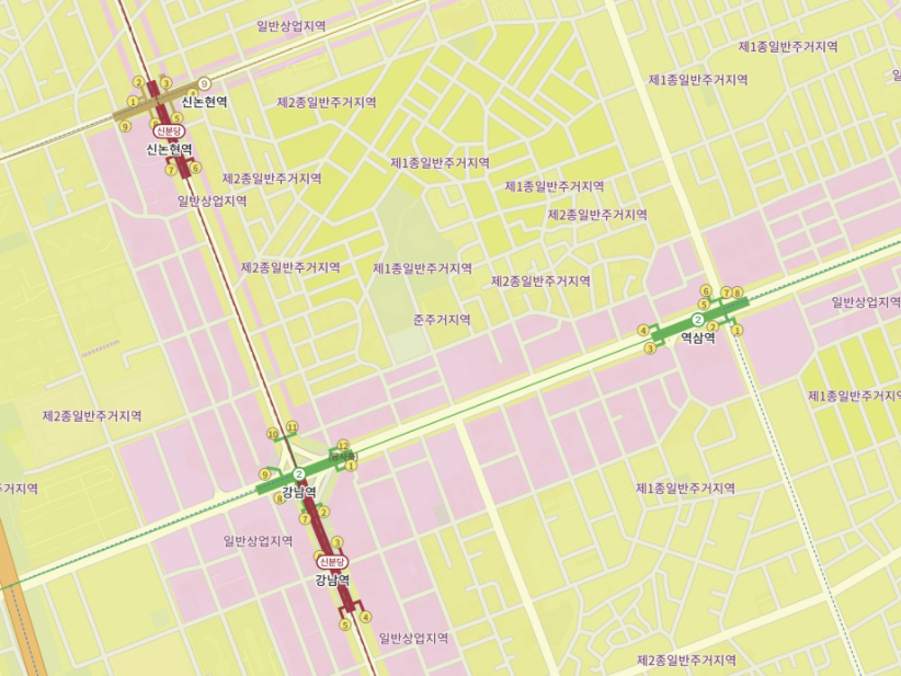 네이버지도, 카카오지도 등에서 '지적편집도'를 선택하면, 색상으로 표시되면서 각각 어떤 땅인지 쉽게 확인 가능합니다. 아래 이미지처럼 보통 핑크색은 '상업지역' 노란색은 '주거지역' 녹색은 '녹지지역' 파란색은 '공업지역'을 나타냅니다.