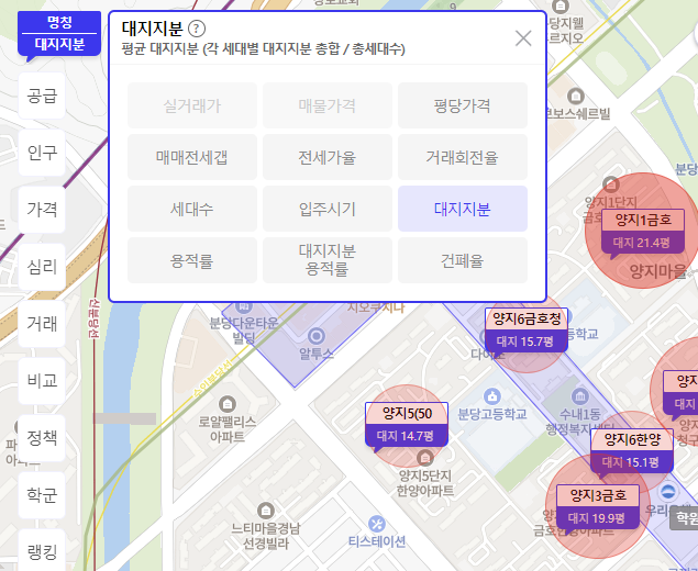 ‘아실’사이트 접속 후 좌측 상단에 있는 ‘명칭’ 말풍선이 있는 곳을 클릭하면 ‘대지지분’을 선택할 수 있습니다. 그러면 아래 이미지와 같이 대지지분의 크기에 맞게 원크기로 표현됩니다. 그리고 아파트이름 아래 ‘대지 20평’과 같이 대지지분이 적혀 있습니다. 원은 크고 진할수록 대지지분이 큰것입니다.